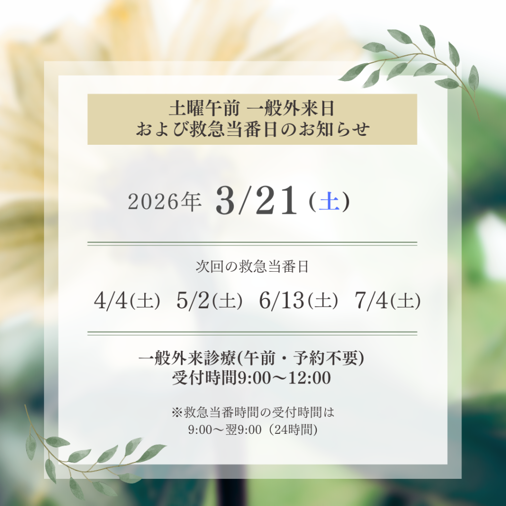 また救急当番日のみ、一般外来診療(予約不要)を行っております。